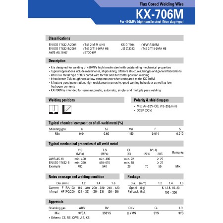 Il filo per saldatura Metal Core è progettato per la saldatura di acciaio ad alta resistenza 490MPa con eccezionali proprietà meccaniche. Le applicazioni tipiche includono macchinari, costruzioni navali, strutture offshore, ponti e fabbricazioni di meccanica generale. Il filo è un tipo metallico di filo animato per la saldatura in posizione piana e orizzontale. Ha una ottima tenacità CVN a basse temperature. Presenta una buona penetrazione, un'elevata resistenza alla porosità, un buon comportamento bagnante con basso contenuto di idrogeno. KX-706M è destinato alla saldatura semiautomatica, automatica, passata singola e multipla.