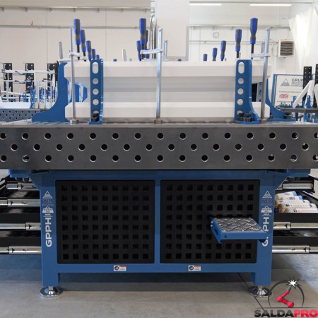 Stazione di saldatura GPPH WeldStation linea SteelEco 3.000 x 1.480 mm con sistema di fori 16mm predisposti in griglia da 100 x 100 mm e carico massimo di 6.000Kg. Grazie alla presenza di pannelli forati, cassetti e vani consente di migliore sensibilmente l'organizzazione della postazione di saldatura.