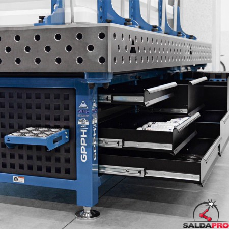 Stazione di saldatura GPPH WeldStation linea SteelEco 2.000 x 1.000 mm con sistema di fori 28mm predisposti in griglia da 100 x 100 mm e carico massimo di 6.000Kg. Grazie alla presenza di pannelli forati, cassetti e vani consente di migliore sensibilmente l'organizzazione della postazione di saldatura.