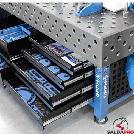 Il cuore del progetto è un sistema di organizzazione intelligente che permette di mantenere tutto perfettamente in ordine. Cassetti spaziosi, pannelli forati e un ampio vano di contenimento offrono una disposizione razionale di utensili e accessori, così ogni elemento è sempre facilmente accessibile. Questo si traduce in un risparmio di tempo e in una maggiore fluidità nelle operazioni di saldatura quotidiane.