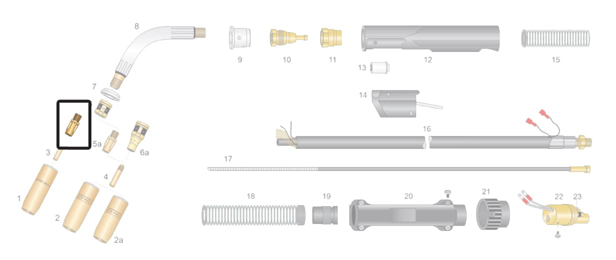Diffusore gas STD 1/4" - 20 (cod. 15.05.404) di ricambio compatibile con torce TRGK® della serie 300A - 400A - 500A per la saldatura a filo continuo MIG. Il diffusore ha una punta Standard e va utilizzato in combinazione con ugello gas, punta guidafilo e supporto ugello della stessa tipologia.
