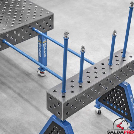 Connettore per tavoli da saldatura GPPH da 1.100 mm, pratico accessorio che consente di un collegamento stabile tra due tavoli di saldatura o un tavolo di saldatura e un supporto Trestle. Compatibile con i tavoli da saldatura linea SteelExpert, SteelMax, SteelPlus, SteelEco e Smart15 con sistema di fori da 28 mm di diametro.