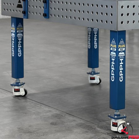 Tavolo da saldatura GPPH SteelPlus INOX 1200x800mm con sistema di fori 16mm, carico massimo di 2000 Kg e gambe con ruote. Grazie alla sua struttura in acciaio inox AISI 304 è ideale per la saldatura di materiali sensibili e a rischio contaminazione.