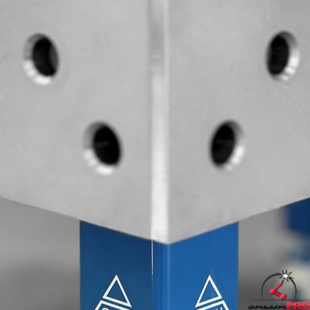 La superficie e le spalle laterali dei tavoli per saldatura SteelMax INOX si contraddistinguono per il loro sistema di fori da 28 mm predisposti in una griglia 100 x 100 mm con diagonale.